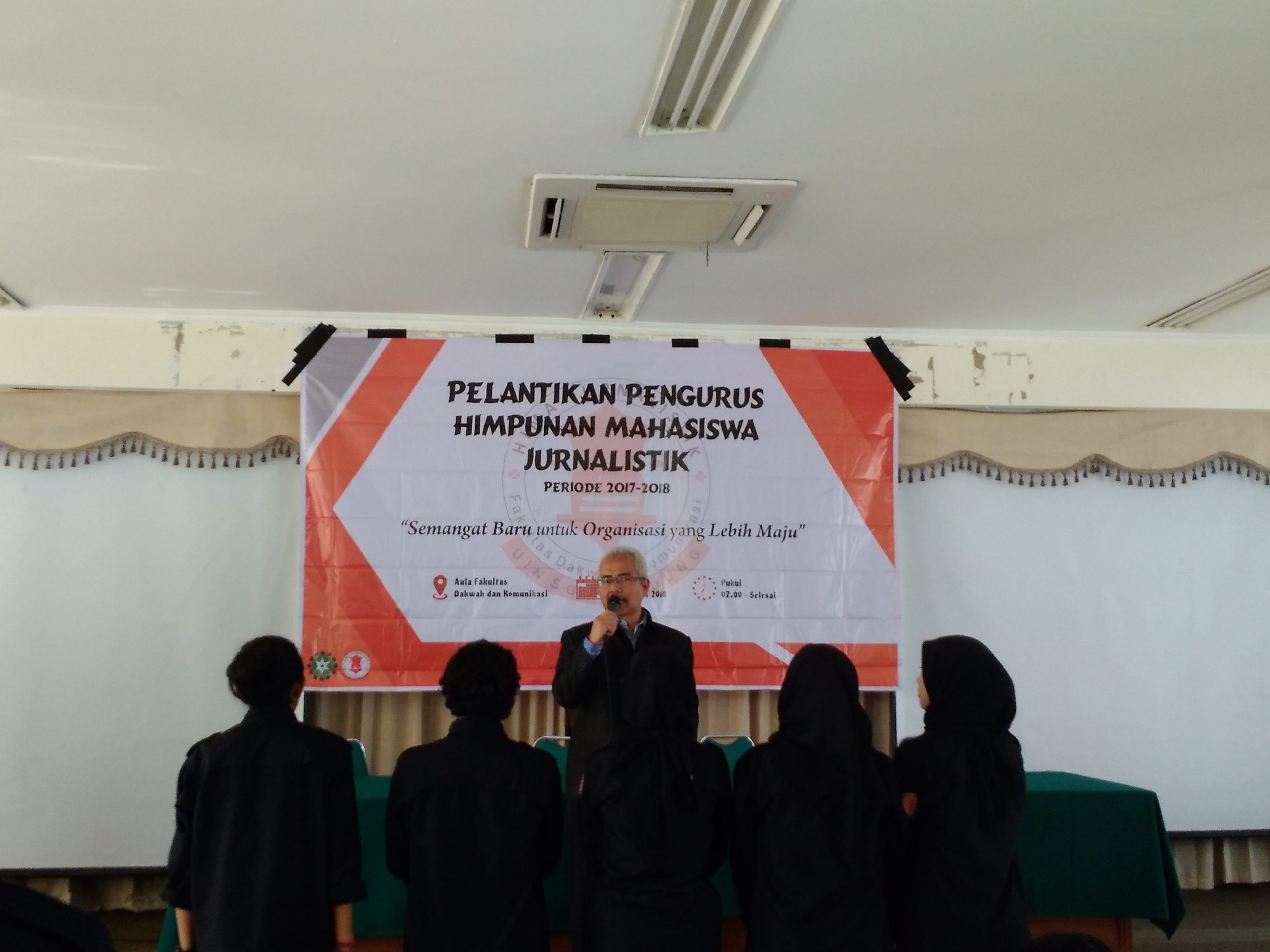 Turut hadir Wakil Dekan Kemahasiswaan Dadan Suherdiana, Ketua Jurusan Ilmu Komunikasi Darajat Wibawa dan Ketua Prodi Jurnalistik Encep Dulwahab. Sebelum melaksanakan tugasnya, HIMA Jurnalistik diwajibkan berikrar. Diwakili oleh lima orang officio di depan, lalu diikuti oleh seluruh jajaran kepengurusan.