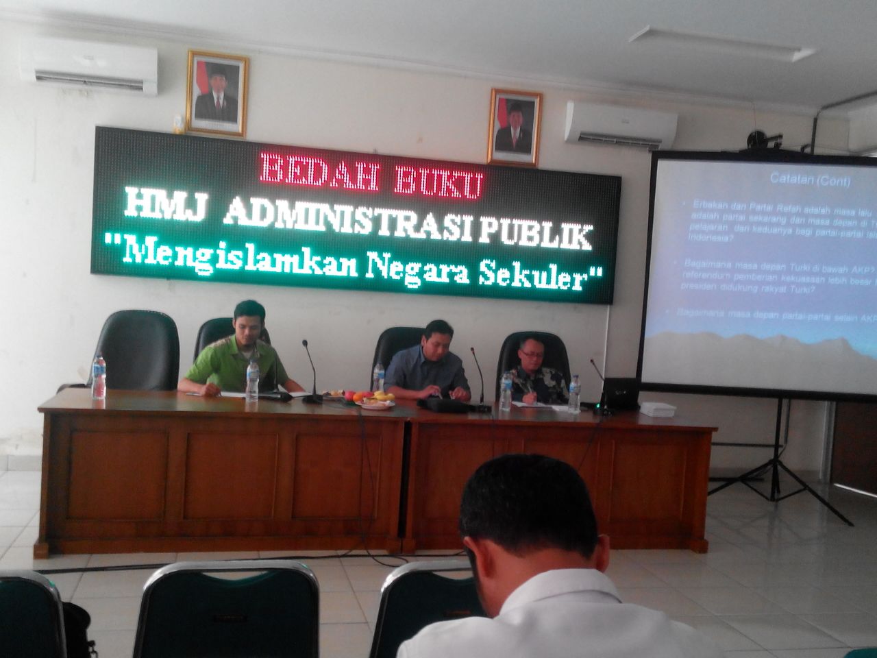 JURNALPOSMEDIA.COM – Himpunan Mahasiswa Jurusan (HMJ) Administrasi PublikM (AP) UIN Bandung menggelar bedah buku yang berjudul ‘Mengislamkan Negara Sekuler.’ Acara bedah buku ini merupakan salah satu program kerja HMJ Administrasi Publik Departemen Pengembangan Intelektual. Bedah buku ini turut dihadiri oleh Penulis buku ‘Mengislamkan Negera Sekuler’ Sahrul Hidayat, dan Dosen Politik Fakultas Ilmu Sosial dan Ilmu Politik (FISIP) UIN Bandung Ahmad Ali Nurdin. Acara ini berlangsung di lantai dua Ruang Sidang FISIP UIN Bandung, Senin (3/4/2017).