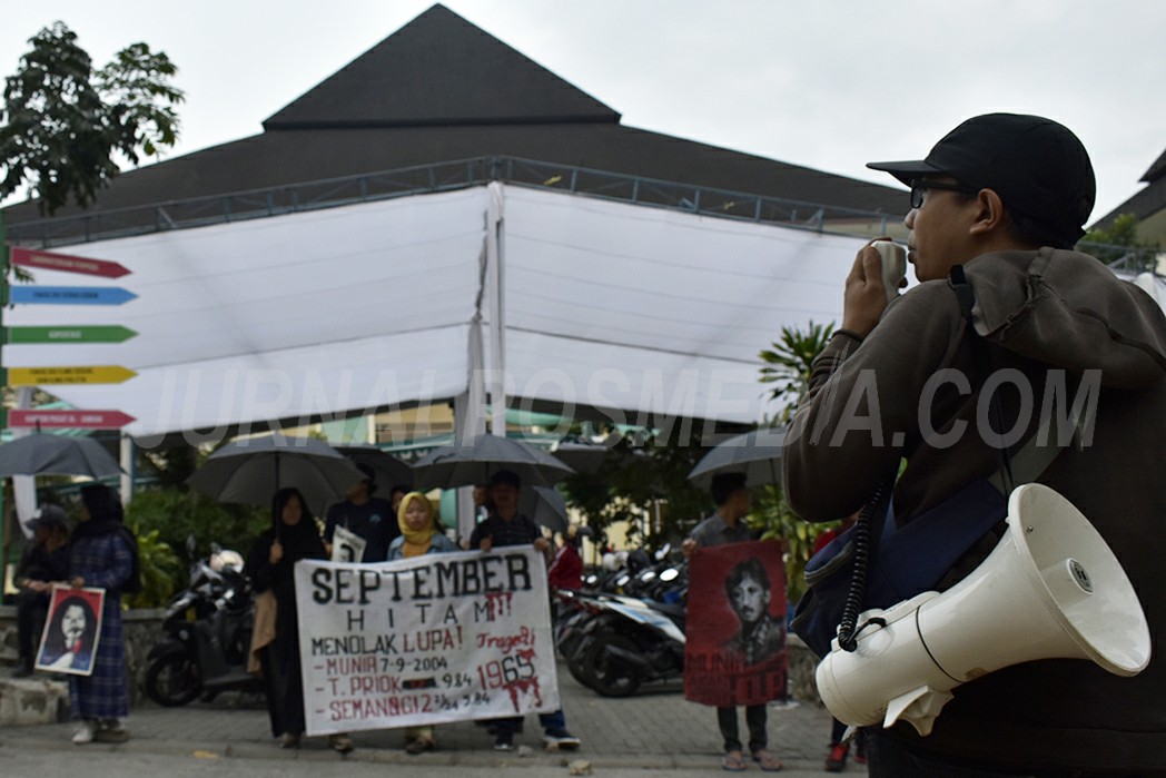 JURNALPOSMEDIA.COM–Aksi kamisan UIN Bandung kali ini digelar di tempat berbeda, Kamis (13/9/2018). Aksi damai yang biasa dilangsungkan di halaman Gedung Rektorat harus beralih ke depan Aula Anwar Musaddad karena tengah direnovasi. Dengan tema besar September Hitam, Aksi Kamisan ke-9 memfokuskan pembahasan terkait kejahatan kemanusiaan yang terjadi sepanjang September sejak Indonesia merdeka hingga hari ini. Aksi Kamisan juga sebagai langkah mengkampanyekan isu-isu kejahatan kemanusiaan yang belum terselesaikan hingga saat ini.
