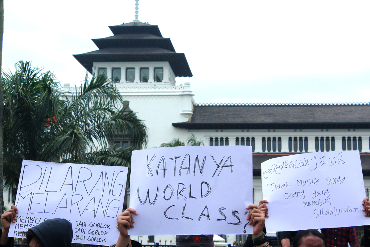 JURNALPOSMEDIA.COM – Komite Rakyat Peduli Literasi menggelar aksi solidaritas terkait penistaan kebebasan akademik dan anti demokrasi larangan membuka lapak buku dan skorsing kepada tiga mahasiswa Telkom University. Dengan mengusung tema ‘Demokrasi dan Kebebasan Akademik’ mahasiswa dari berbagai universitas dan gerakan pro-demokrasi berkumpul di depan Gedung Sate, lalu berorasi di depan Kantor Pusat Graha Telkom Bandung pada, Selasa (14/03/2017).