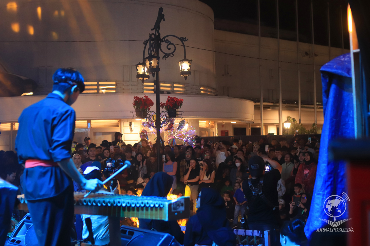 Ribuan pengunjung tengah menonton penampilan musik dari Angklung Taman di Asia Africa Festival 2024, Jl. Braga, Kota Bandung, Sabtu (6/7/2024). Acara ini merupakan bagian dari Asia Africa Festival 2024 yang menampilkan berbagai pertunjukan musik dan puluhan tenant yang bisa dinikmati hingga pukul 10 malam.