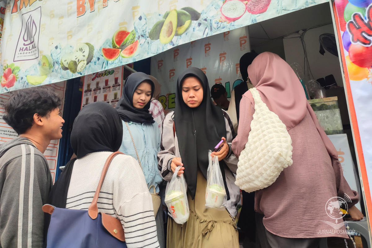 Pelanggan keluar dari antrean membawa pesanannya di Manisi, Cibiru, Jumat (15/11/2024). Promo ini diadakan selama seminggu dari tanggal 13-19 November 2024 dalam rangka memeriahkan ulang tahun Pusat Es yang ke-1. Varian yang ditawarkan pun beragam, dari mulai jus hingga smoothies dengan harga mulai dari Rp6000 saja.
