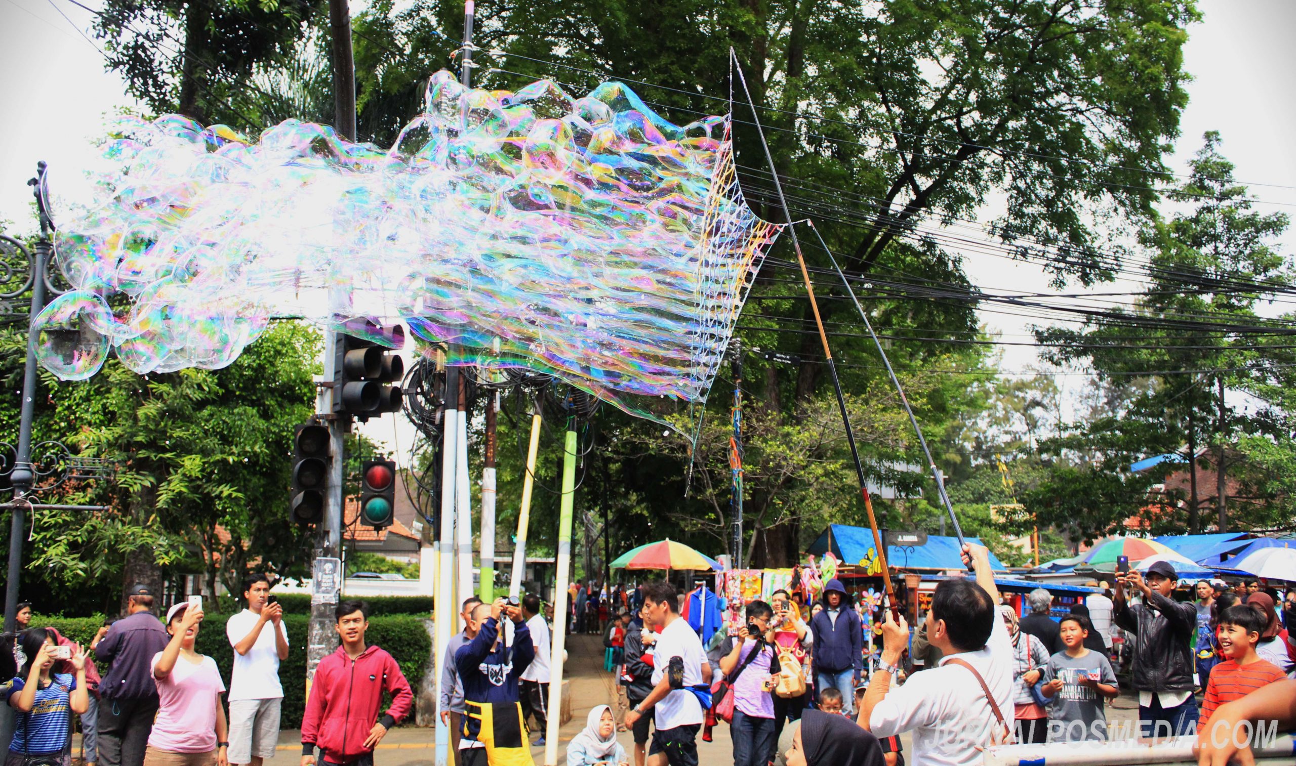 Teguh Siswanto mempertunjukkan atraksi gelembung-gelembung sabun dalam ukuran besar, di Car Free Day Dago, Minggu (3/3/2019). Atraksi Teguh cukup menyita perhatian masyarakat mulai dari orang dewasa hingga anak-anak pun ikut bersuka ria ketika balon atau gelembung jumbo dalam berjumlah banyak ini muncul.