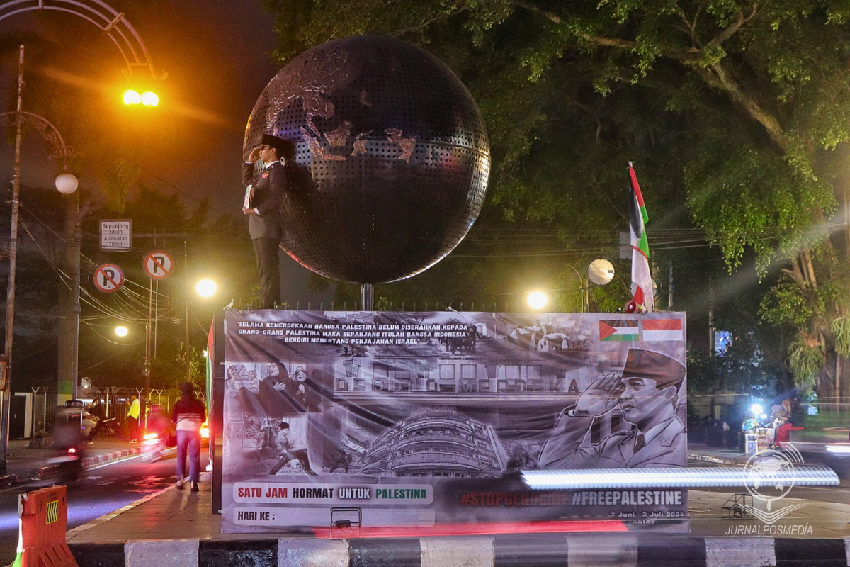 Komunitas Mata Holang adakan aksi “Gerakan Satu Jam Hormat untuk Palestina” di Monumen Solidaritas Asia Afrika, Kota Bandung, Jumat (14/6/2024). Aksi ini berlangsung dari tanggal 7-30 Juni 2024 sebagai simbol penghormatan generasi muda dalam memperjuangkan kemerdekaan Palestina.
