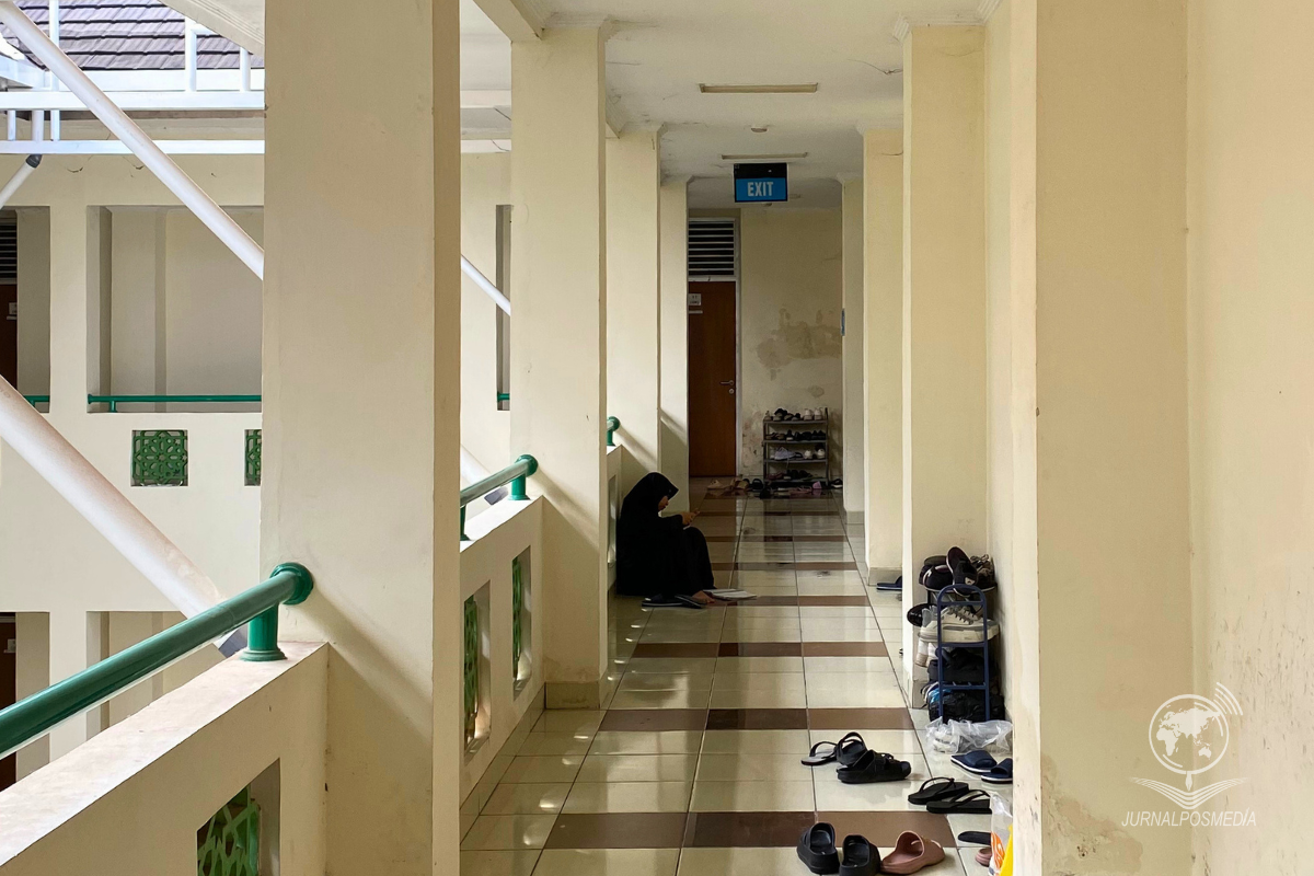 Seorang mahasantri duduk di pojok lorong lantai 4 Ma’had Al-Jamiah, UIN Bandung, Minggu (23/6/2024). Lorong yang tadinya ramai kini sepi akibat beberapa mahasantri pulang ke kampung halamannya masing-masing.