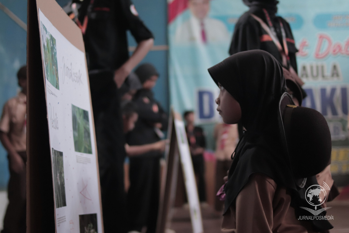Seorang siswi SDN Pakuhaji 02 tengah melihat hasil karya pada pameran foto di Gedung Serbaguna Desa Pakuhaji, Kabupaten Subang, Sabtu (23/11/2024). Sebagai salah satu rangkaian penutup, Jurnalistik Mengabdi (Jurdi) program kerja Hima Jurnalistik Bidang Insos gelar pameran foto sebagai bentuk kenangan selama seminggu penuh pengabdiannya.