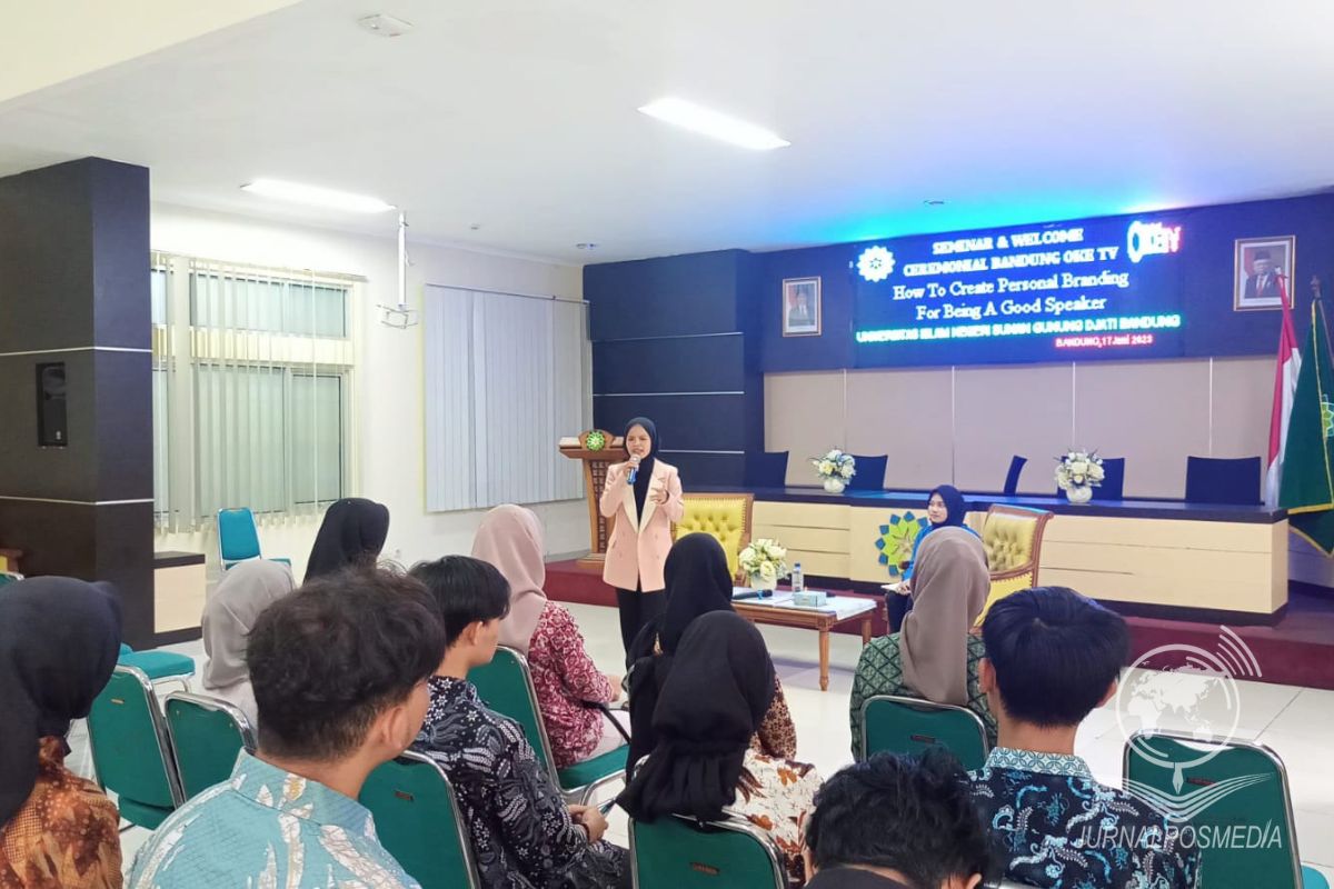 Pemateri Ani Mulyani memaparkan materi pada partisipan di acara Seminar yang digelar oleh Bandung Oke TV di ruang Auditorium Fakultas Adab dan Humaniora It. 4 UIN Bandung, Jalan A. Nasution No. 105, Cibiru, Kota Bandung, Sabtu (17/6/2023). Seminar ini bertemakan “How To Create Personal Branding For Being A Good Speaker” dengan tujuan memberikan pelatihan dalam public speaking agar membantu Mahasiswa menjadi lebih percaya diri di depan banyak orang.