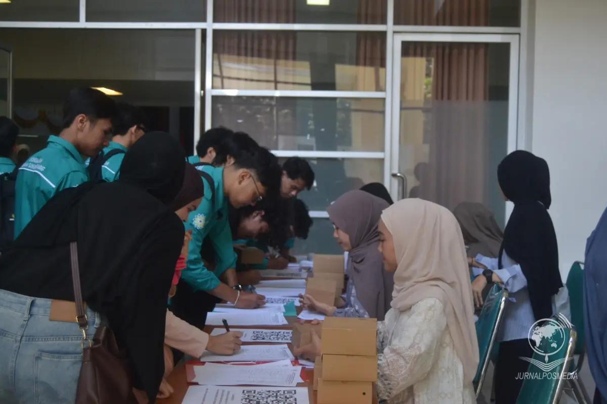 Mahasiswa yang mengikuti kuliah umum tengah mengisi absensi di Aula Anwar Musaddad, UIN Bandung, Kamis (16/4/2026).