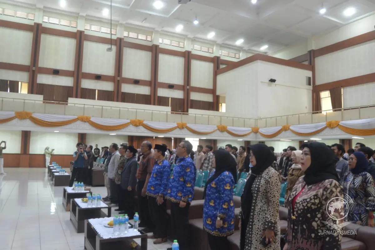 Para tamu undangan tengah menyanyikan lagu kebangsaan Republik Indonesia di Aula Anwar Musaddad, UIN Bandung, Kamis (16/4/2026).