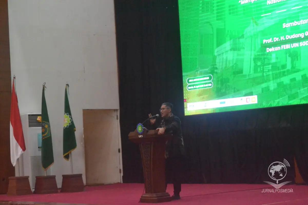 Dekan Fakultas Ekonomi dan Bisnis Islam UIN Bandung, Dudang Gojali, tengah memberikan sambutan, mengungkapkan rasa bangga karena diadakannya Kuliah Umum di Aula Anwar Musaddad, UIN Bandung, Kamis (16/4/2026).