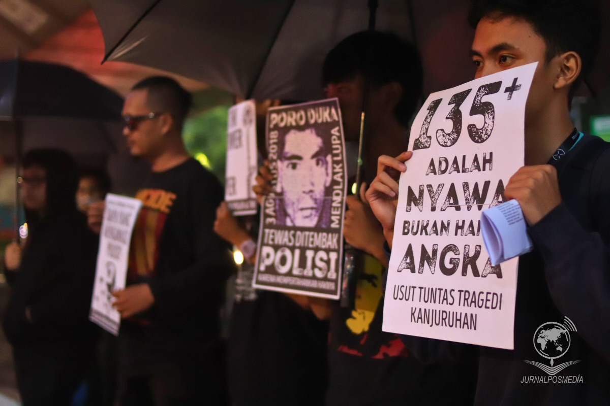 Peserta aksi membawa poster berisi beberapa tuntutan mengenai kasus Kepolisian Negara Republik Indonesia (Polri) di Taman Pasupati, Bandung Wetan, Kamis (4/7/2024). Aksi yang sempat berpindah dari depan Gedung Sate ke Taman Pasupati akibat hujan deras tersebut membahas mengenai kurangnya kinerja dan kasus yang belom terselesaikan sehingga menurunnya tingkat kepercayaan masyarakat kepada Polri.