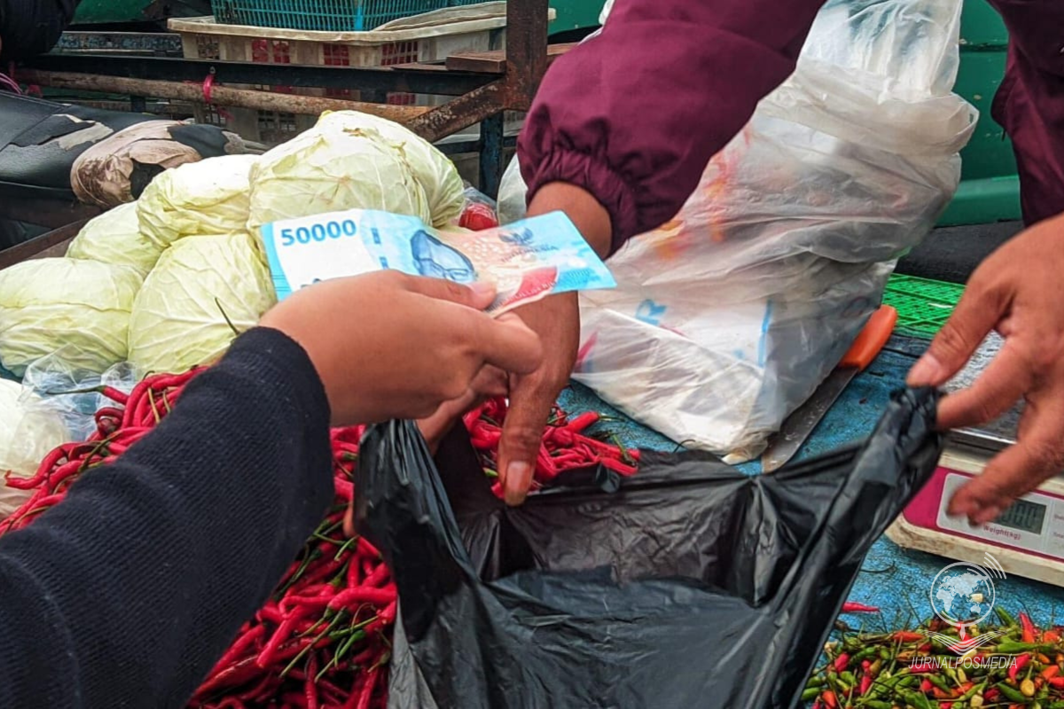 Seorang pedagang tampak sibuk melayani ibu-ibu yang sedang menawar harga cabai merah keriting di Pasar Ujung Berung, Jl. Jendral Abdul Haris Nasution, Pasirwangi, Kecamatan Ujung Berung, Kota Bandung, Minggu (1/6/2025 )
