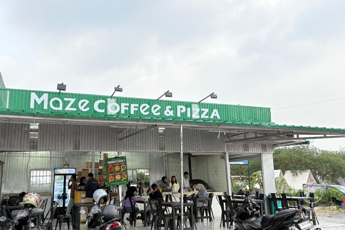 Pengunjung menikmati sore di Maze Coffee & Pizza, Jalan Gedebage, Kota Bandung, Sabtu (9/8/2025). Tempat ini dikenal dengan harga menu yang terjangkau dan konsep seru membuat piza sendiri sesuai kreasi pelanggan. Dengan suasana santai dan pelayanan ramah, Maze menjadi pilihan favorit untuk nongkrong bersama teman atau keluarga.