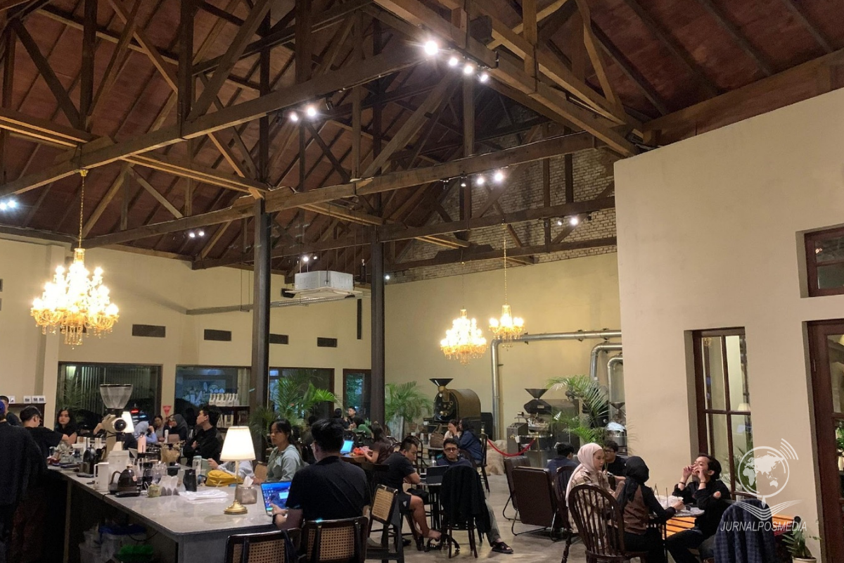 Suasana ramai Pabrik Kopi Dartoyo di malam hari, Jalan Naripan, Kecamatan Sumur Bandung, Kota Bandung, Jumat (25/7/2025). Berdiri sejak akhir Oktober 2024, Pabrik Kopi Dartoyo sukses menjadi primadona di kalangan pencinta kopi. Tempat ini menghadirkan sensasi baru berupa live roasting, di mana para penikmat kopi bisa menyaksikan langsung proses pembuatan kopi mulai dari biji hingga menjadi bubuk dengan cita rasa autentik.
