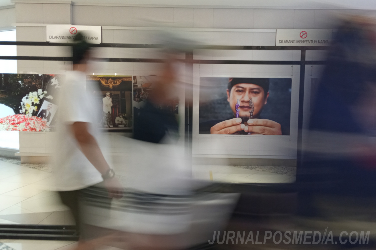 Pengunjung mengamati karya foto pada Pameran ARKE Kilas Balik Jabar 2019-2020 di 23 Paskal, Bandung, Senin (21/12/2020). Pameran tersebut menampilkan 58 foto yang diambil selama tahun 2019-2020 dari karya 11 pewarta foto Antara Biro Jawa Barat.