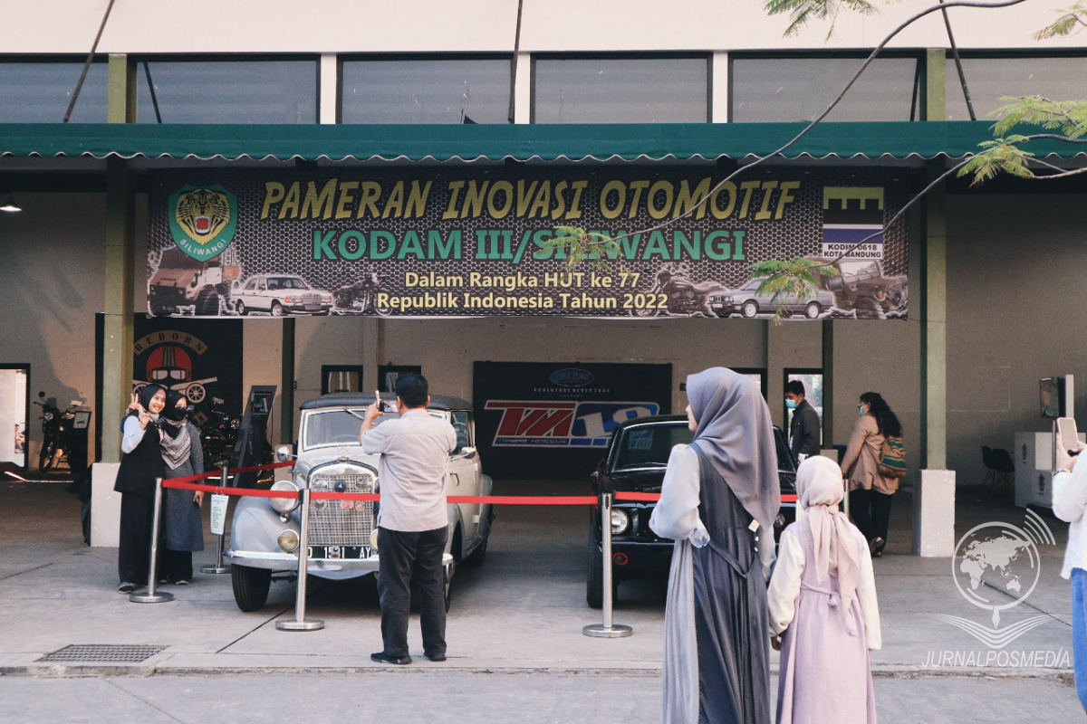 Pengunjung berfoto pada Pameran Inovasi Kreatif di Kiara Artha Park, Jalan Banten, Kota Bandung, Senin (25/7/2022). Pameran tersebut diselenggarakan Kodam III/Siliwangi dalam rangka memeriahkan jelang Hari Ulang Tahun (HUT) Republik Indonesia ke-77 yang dimulai dari tanggal 22 hingga 27 Juli 2022. Pameran tersebut menampilkan beberapa kendaraan mulai dari roda dua hingga roda empat berpartisipasi di dalamnya. Selain otomotif, terdapat bazar dan juga hiburan musik yang ikut memeriahkan pameran tersebut.