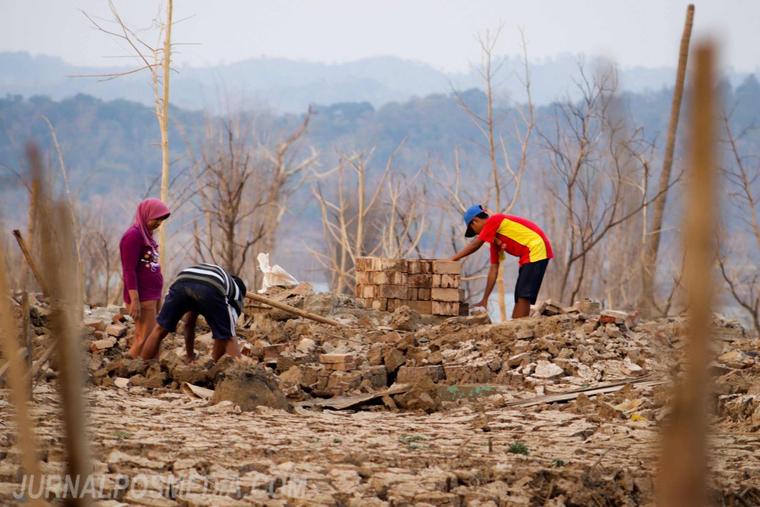 Warga memungut bongkahan bangunan di kawasan Waduk Jatigede, Darmaraja, Kabupaten Sumedang, Sabtu (29/9/2018). Menurut masyarakat anggaran pemerintah senilai Rp.122 Juta/Kepala Keluarga (KK) dirasa tidak cukup untuk mengganti rumah yang terendam. Sehingga masyarakat mengumpulkan bekas bahan bangunan untuk menutupi kekurangan pembangunan rumah baru.