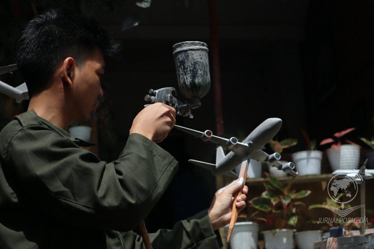 Arul (21) menyelesaikan salah satu miniatur pesawat dari bahan dasar pipa di Jalan Sadananya, Ciamis, Jawa Barat, Selasa (22/02/2022). Ia merupakan mahasiswa IT yang beralih profesi menjadi pembuat miniatur, pekerjaan ini sudah ditekuninya selama setahun. Miniatur dijual dengan kisaran harga Rp250 ribu sampai Rp400 ribu per unit.
