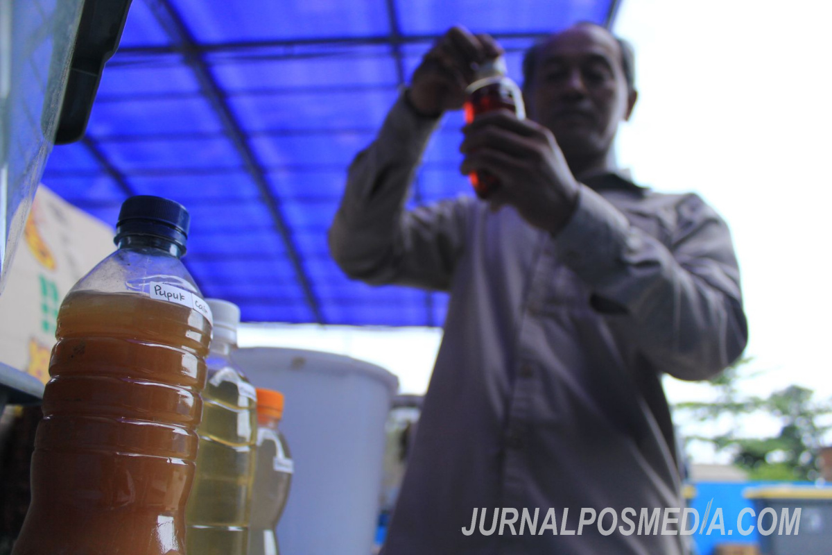Petugas tim pengelolaan sampah Pasar Ciwastra menunjukkan hasil pengolahan sampah organik menjadi pupuk cair dan padat di tempat pengelolaan sampah Pasar Ciwastra, Jalan Rancasawo, Kota Bandung, Kamis (21/10/2019). Pengelolaan sampah di Pasar Ciwastra menjadi percontohan pengelolaan sampah tradisional di kota Bandung, dari sekitar 800kg sampah organik pedagang Pasar Ciwastra, hampir 70 persen sudah diolah menjadi pupuk, magot, dan pakan.
