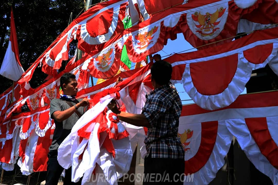 Pedagang menata bendera dagangannya di Jalan Surapati, Kota Bandung, Selasa (14/8/2018). Jelang Hari Ulang Tahun kemerdekaan Republik Indonesia (HUT RI) ke-73 17 Agustus mendatang, sejumlah pedagang menjual pernak-pernik dan aksesoris bendera yang dijual tergantung ukuran dengan kisaran harga Rp 15.000 hingga Rp 350.000.