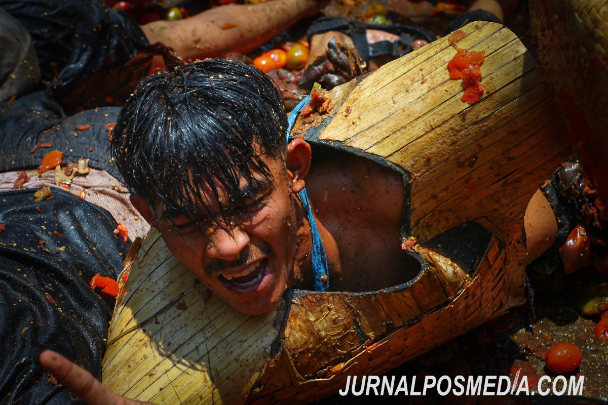 Warga saling melempar tomat pada tradisi Rempug Tarung Adu Tomat di Kampung Cikareumbi, Desa Cikidang, Kecamatan Lembang, Kabupaten Bandung Barat, Minggu (13/10/2019). Tradisi tahunan yang digelar setiap bulan Muharam tersebut merupakan bagian dari Hajat Buruan yang bermakna membuang keburukan pada diri manusia.