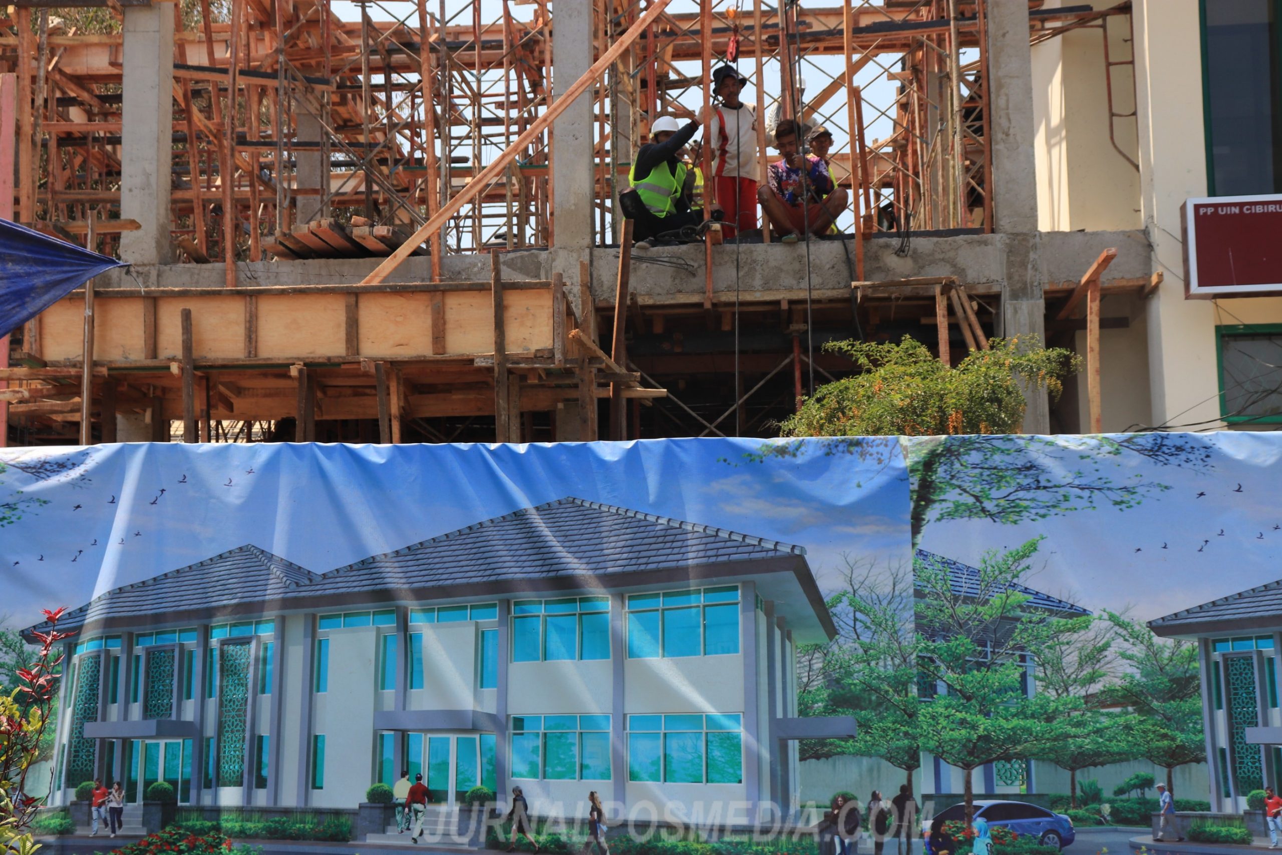 Pekerja merenovasi Gedung Rektorat (O.Djauharuddin AR) UIN Sunan Gunung Djati Bandung di Jalan A.H. Nasution No 105 Cibiru, Kota Bandung, Sabtu (22/9/2018). Menurut keterangan pekerja, renovasi yang diperkirakan rampung pada 28 November 2018 ini, memakan biaya hampir tiga milyar.