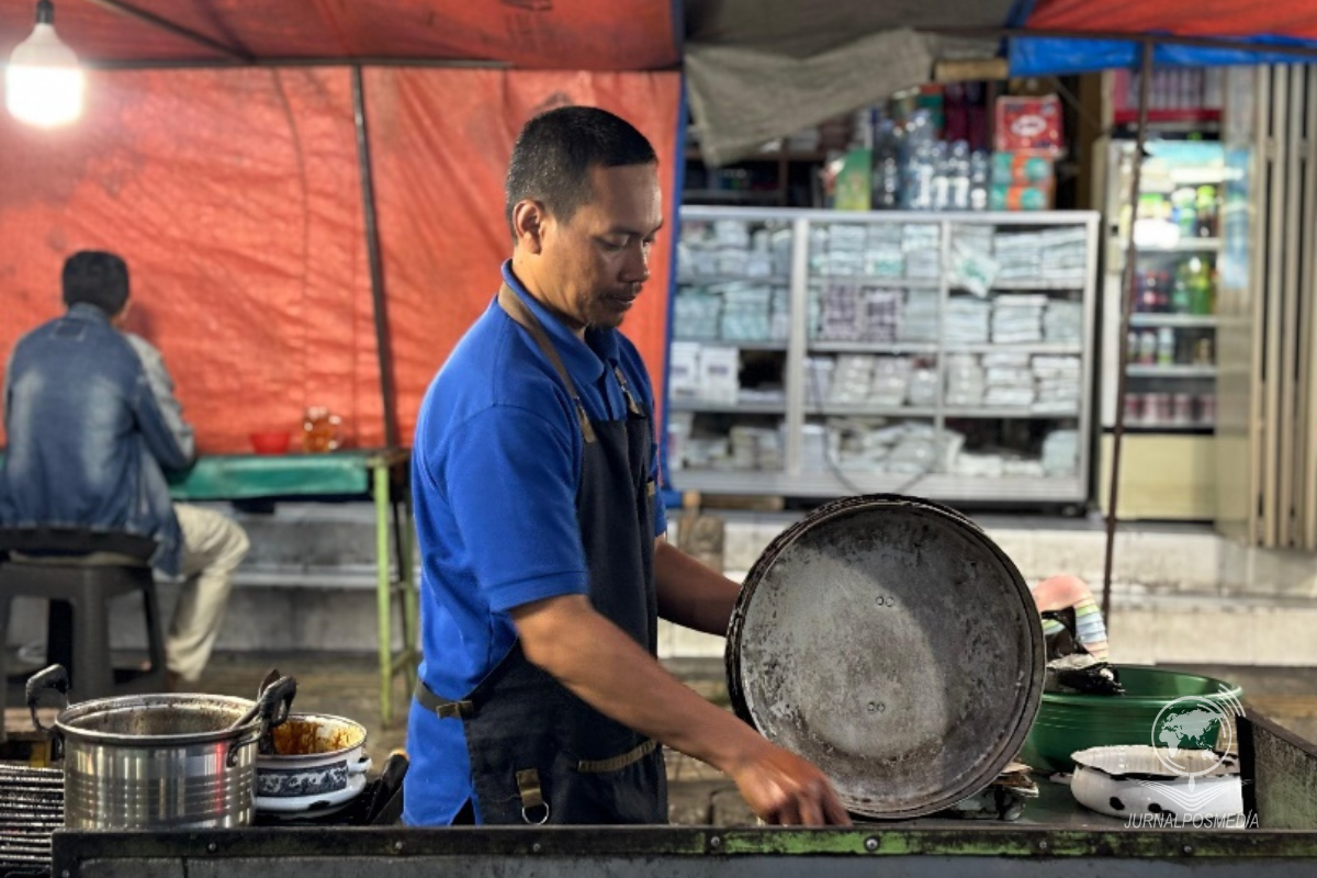 Seorang penjual kaki lima tengah memasak di lapaknya, di Jalan Siliwangi, Garut, Minggu (27/7/2025).