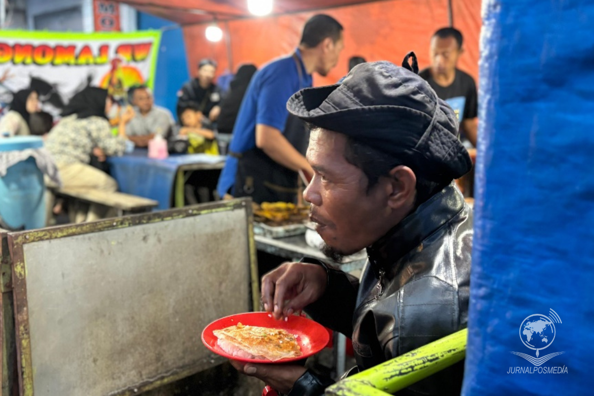 Seorang pengunjung menikmati makanan di tengah suasana ramai Pasar Ceplak, di Jalan Siliwangi, Garut, Minggu (27/7/2025).
