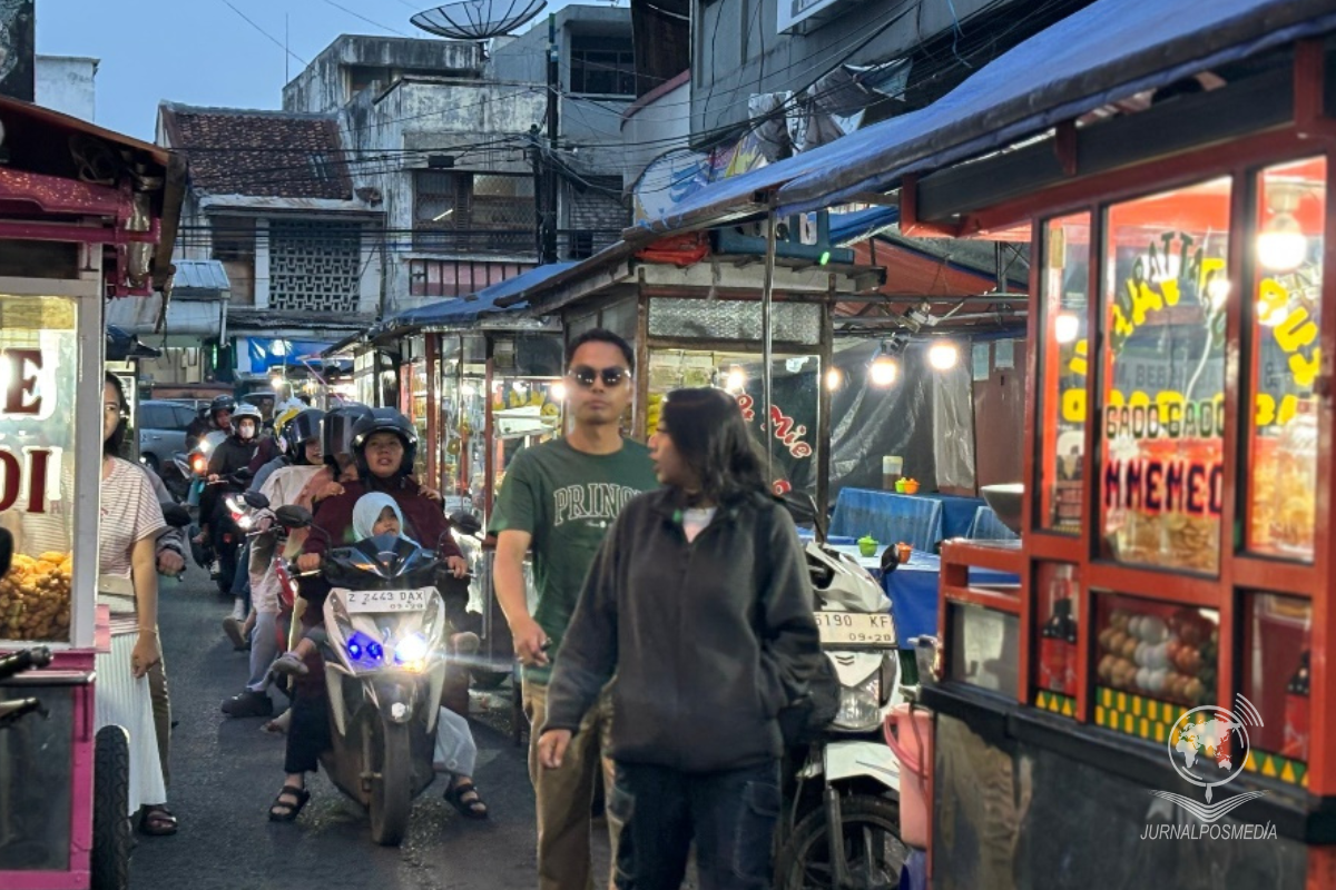 Suasana Pasar Ceplak dengan deretan gerobak makanan dan pengunjung yang memadati jalanan sempit, di Jalan Siliwangi, Garut, Minggu (27/7/2025). Nama yang berasal dari gurauan Bahasa Sunda lawas tahun 1960-an tentang bunyi khas makan nasi oyék sambil “céplak.” Hingga kini, Pasar Ceplak masih menjadi destinasi kuliner populer dengan sajian makanan tradisional dan modern seperti mayang, gegetuk, sate, soto, dan martabak.