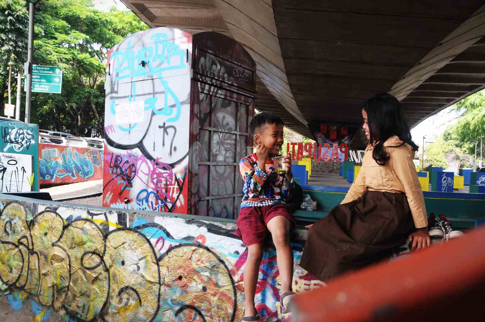 Sejumlah anak kecil bermain dikawasan Taman Pasupati, Jalan Tamansari, Kota Bandung, Kamis (12/9/2019). Keberadaan Street Library (Perpustakaan Jalanan) ini diluncurkan sebagai upaya meningkatkan minat baca warga kota Bandung, namun sampai saat ini keberadaan perpustakaan mini itu tidak berfungsi hingga jadi sasaran vandalisme.