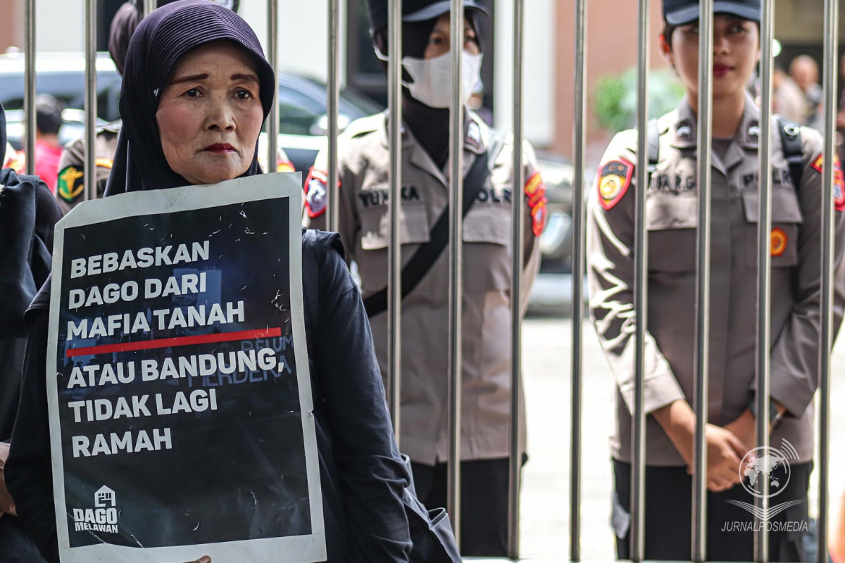 Sejumlah massa aksi menunjukkan poster tuntutan di PTUN Bandung, Jl. Diponegoro, Kota Bandung, Rabu (12/2/2025). Diinisiasi Forum Dago Melawan, warga Dago kembali gelar aksi yang menuntut Pengadilan Tata Usaha Negara (PTUN) untuk melangsungkan persidangan terbuka perjalanan kasus Gugatan Muller bersaudara kepada tergugat Dinas Kependudukan dan Pencatatan Sipil (Disdukcapil) Kabupaten Bandung terkait penggusuran tanah Dago Elos.