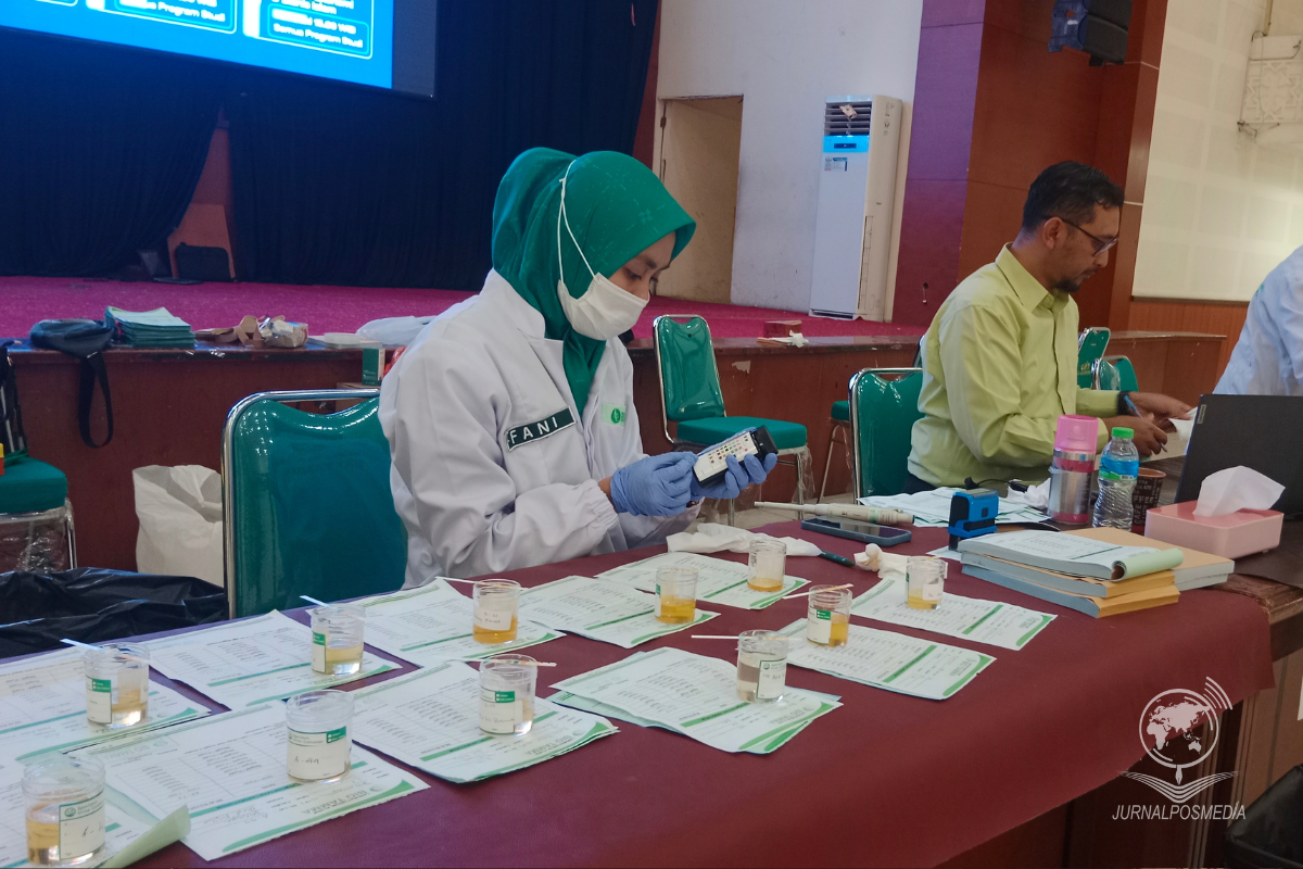 Para petugas panitia tengah melakukan pengecekan sampel tes urin para mahasiswa di Gedung Anwar Musaddad, Senin (12/8/2024). Kegiatan ini telah berlangsung dari tanggal 10-16 Agustus 2024 di Gedung Aula Anwar Musaddad Kampus I yang nantinya dihadiri oleh mahasiswa baru tahun ajaran 2024/2025. Pemeriksaan kesehatan ini dibuka mulai pukul 07.00-12.00 WIB kemudian dilanjutkan kembali pada pukul 13.00-16.00 WIB. Dalam rangkaian pemeriksaan kesehatan terdapat beberapa tes yang harus dilakukan mahasiswa baru seperti tes urin, tes tinggi badan dan berat badan, dan tes buta warna. Pemeriksaan kesehatan ini merupakan kegiatan rutin setiap tahunnya untuk mempersiapkan kondisi fisik dan kualitas kesehatan para mahasiswa baru sebelum memasuki proses perkuliahan.