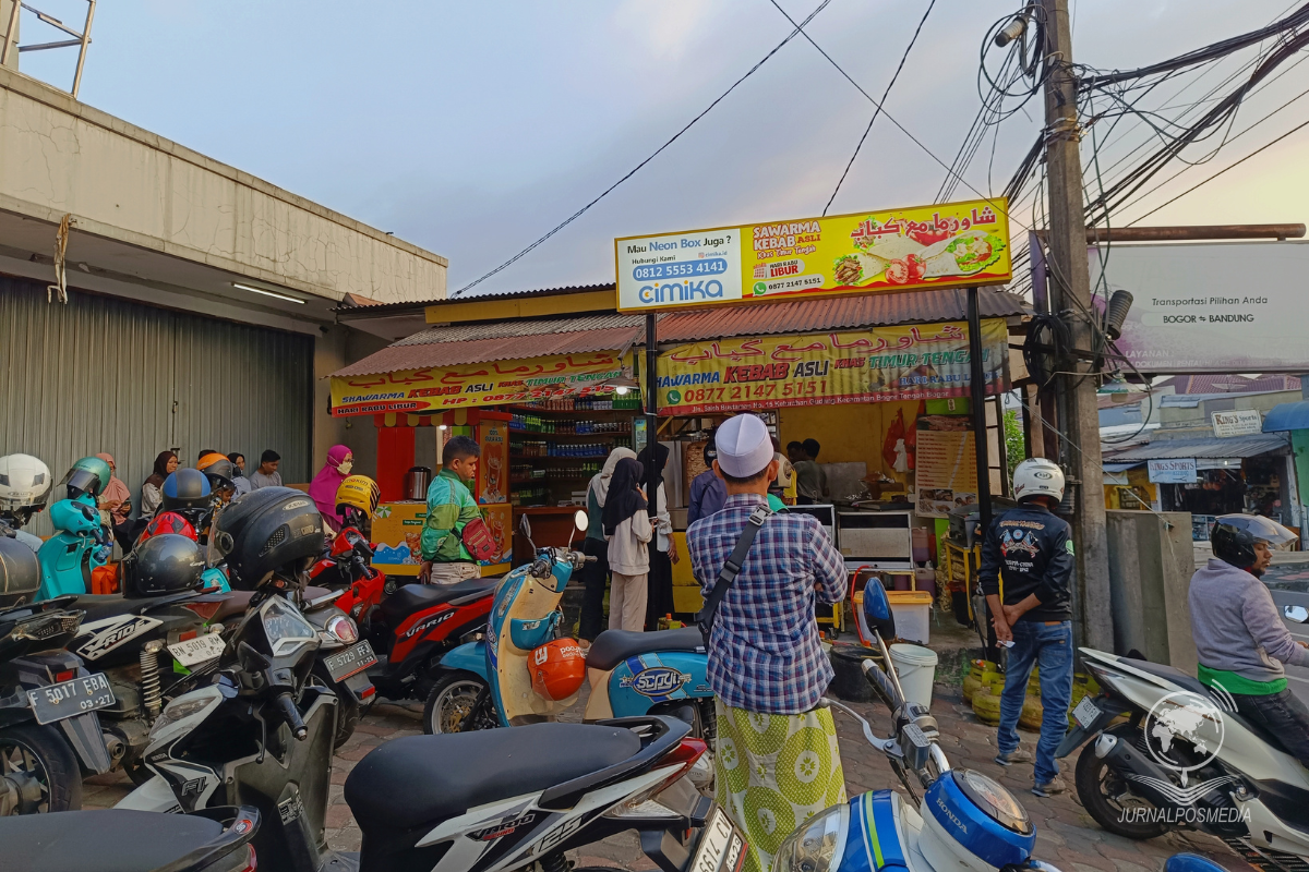 Warga penuhi Warung Kebab Sawarma makanan khas Timur Tengah di Jl. Saleh Bustaman, Kota Bogor, Senin (15/7/2024). Warung kebab ini dibuka pada tahun 2018 dan menjadi populer akhir-akhir ini karena ukurannya yang jumbo. Warung Kebab Sawarma ini buka setiap hari dari jam 16.00 WIB hingga sehabisnya dengan menawarkan berbagai varian daging.