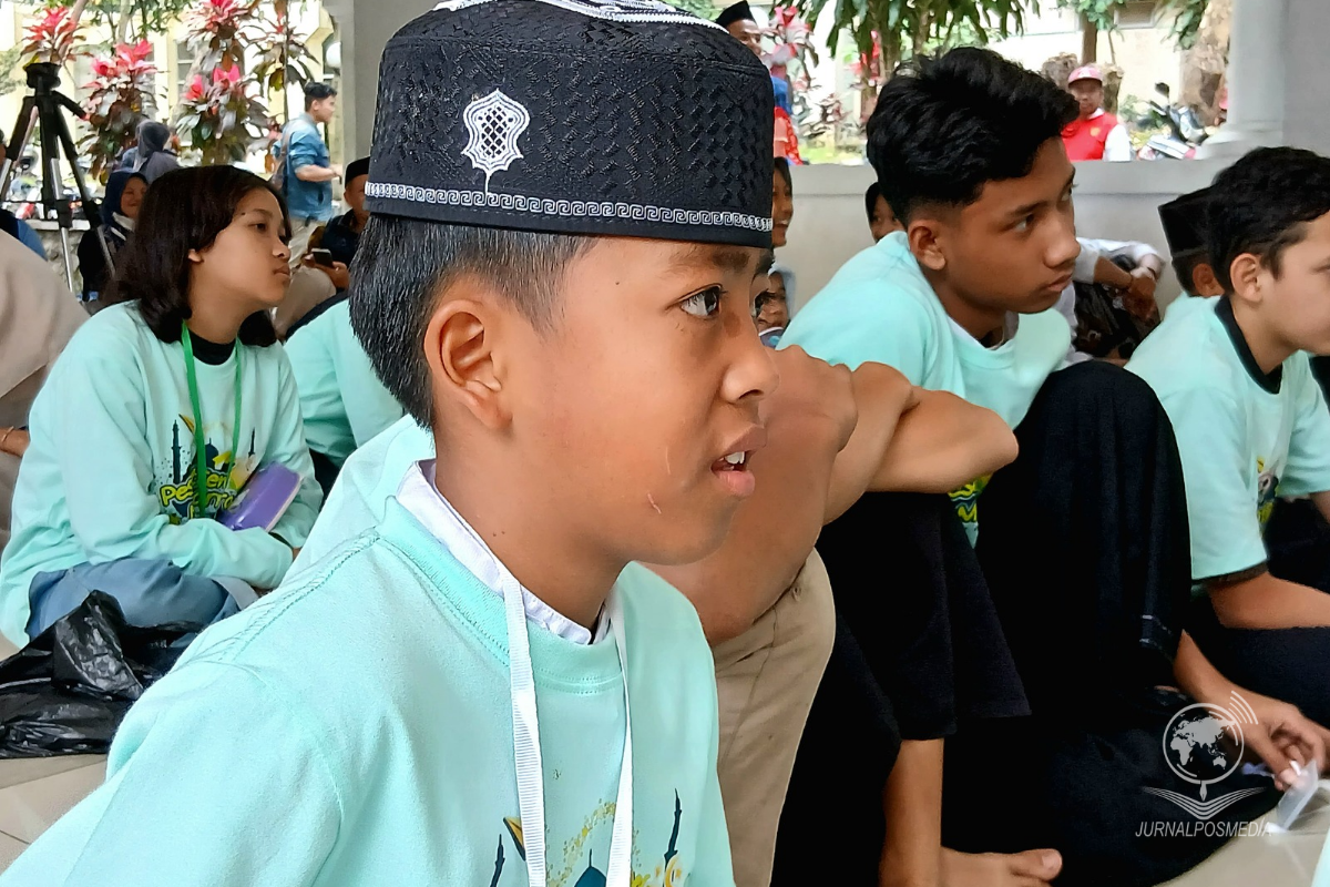 Potret peserta tengah melakukan interaksi dengan si Cepot pada acara Pesantren Muharram 1447 H, di Masjid Ikomah UIN Bandung, Sabtu (26/7/2025).