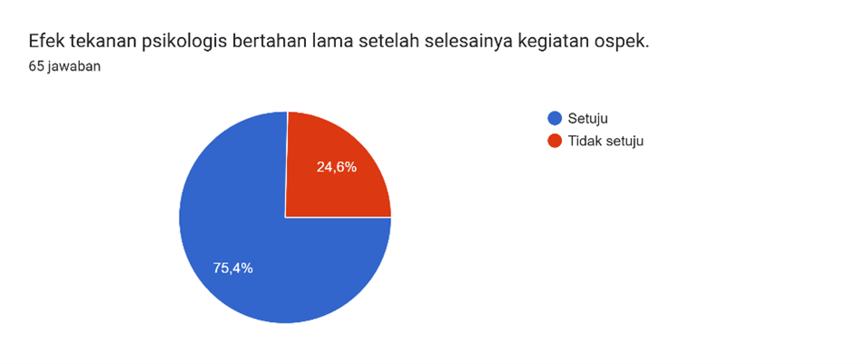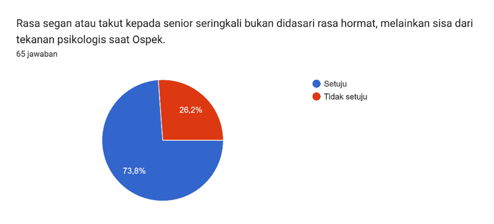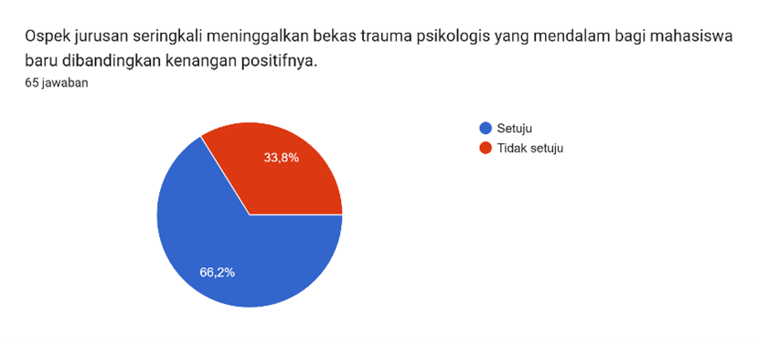 Hingga periode pengambilan data, terdapat 65 responden mahasiswa dari berbagai universitas yang mengisi formulir secara sukarela melalui metode convenience sampling. Hasil kuesioner menunjukkan bahwa 66,2% responden menyatakan setuju bahwa ospek jurusan lebih sering meninggalkan bekas trauma psikologis yang mendalam, sementara 73,8% responden menilai rasa segan atau takut kepada senior bukan didasari rasa hormat, melainkan sisa tekanan psikologis yang dialami saat ospek. Selain itu, 75,4% responden juga menyatakan bahwa efek tekanan psikologis tersebut bertahan lama setelah kegiatan ospek selesai. Temuan ini mengindikasikan bahwa dampak psikologis ospek tidak berhenti ketika rangkaian kegiatan berakhir, melainkan berlanjut dalam relasi mahasiswa baru dengan lingkungan kampusnya.