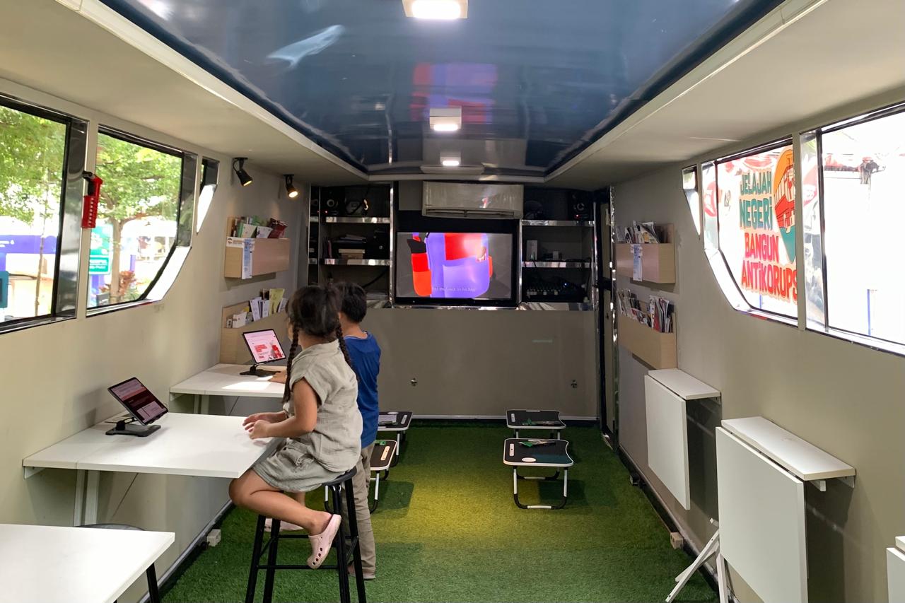 “Nah bus ini ‘kan sebetulnya memang kita sebut ini sebagai kelas berjalan. Di dalamnya terdapat tablet untuk edukasi, TV untuk menayangkan film-film antikorupsi, dan perpustakaan mini. Jadi informasi yang ada di sini kita share apa yang sudah ada seperti dongeng, cerita, komik, serta panduan bagi masyarakat untuk membangun budaya antikorupsi,” jelasnya.