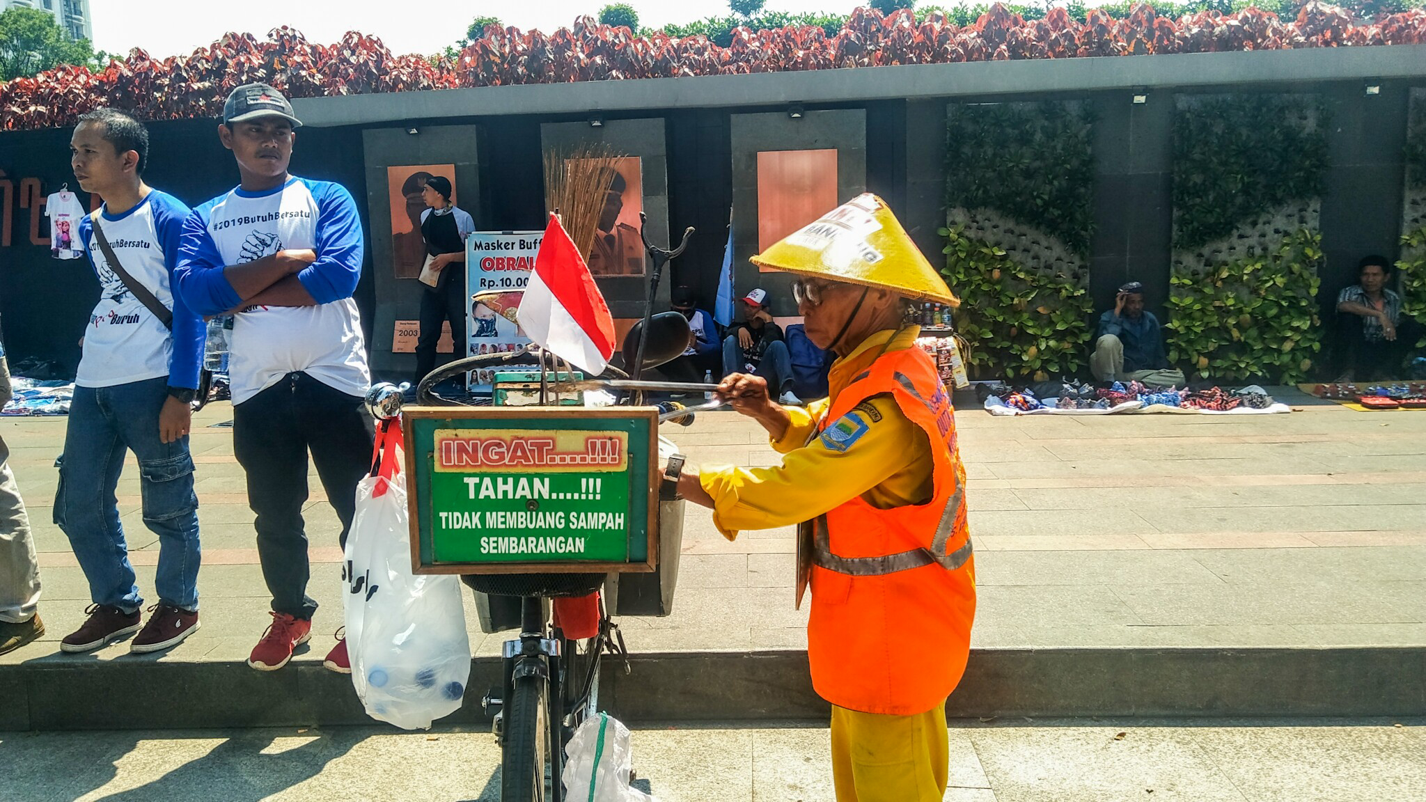 Sosok tersebut bernama Sariban. Pria berusia 74 tahun itu menerobos masuk ke dalam kerumunan massa dengan menggunakan baju tugasnya dan mengenakan topi caping seraya membawa karung berisi sampah beserta capitan untuk memungut sampah.