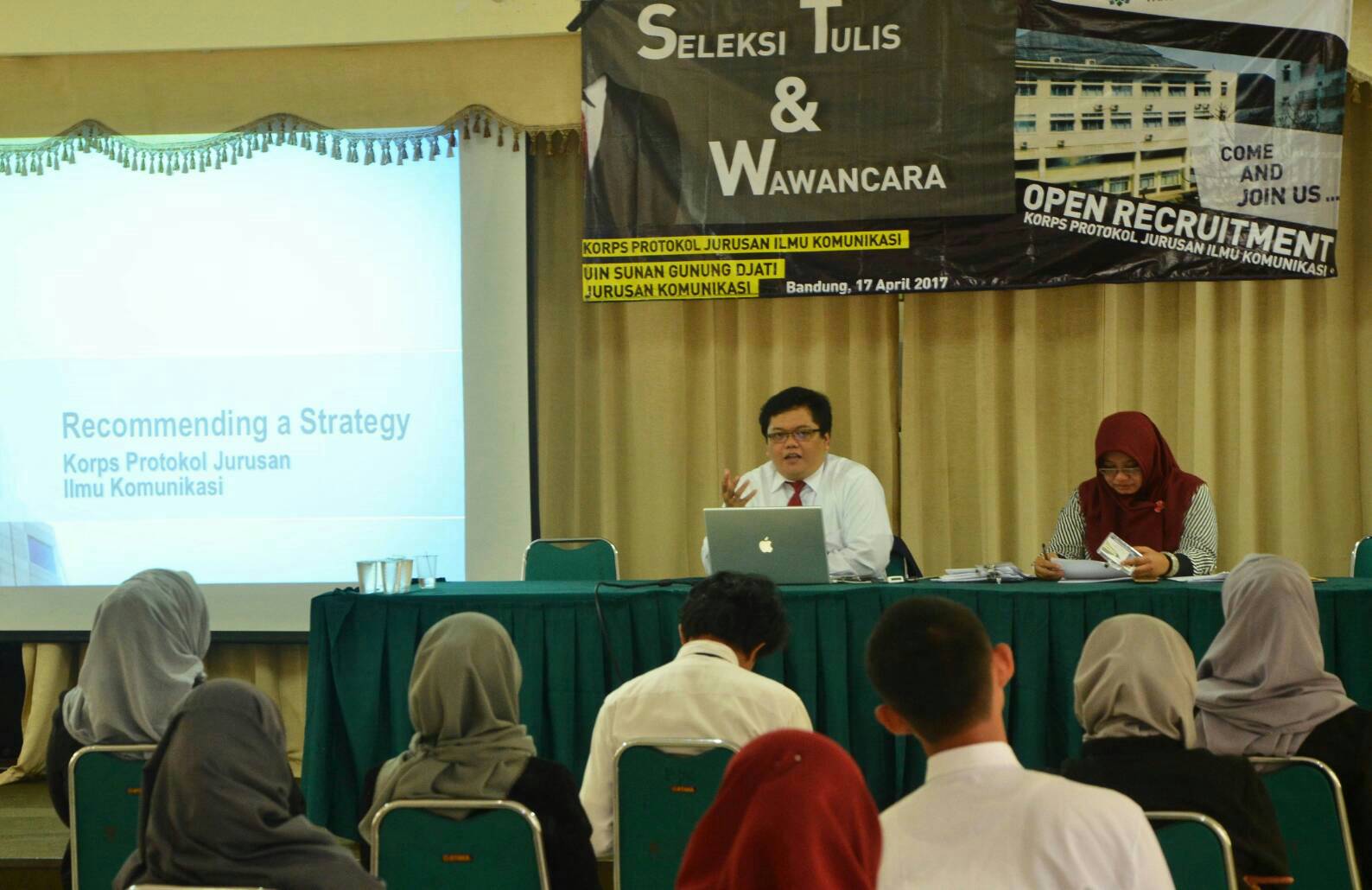 Penyampaian Recommending a Strategy Korps Protokol Jurusan Komunikasi oleh pembina, usai seleksi tes tulis yang bertempat di Aula Fakultas Dakwah dan Komunikasi, Senin (17/04/2017). (Muhammad Fahmi/ Kontributor)