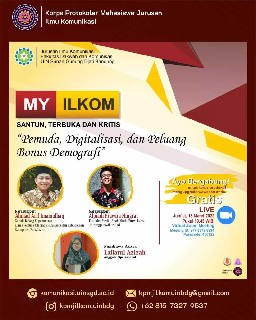 Jurusan Ilmu Komunikasi, Fakultas Dakwah dan Komunikasi (FDK) UIN Bandung menyelenggarakan Talk Show My Ilkom ke-18 bertajuk “Pemuda, Digitalisasi, dan Peluang Bonus Demografi”, menggunakan Zoom Meeting pada Jumat (18/3/2022).